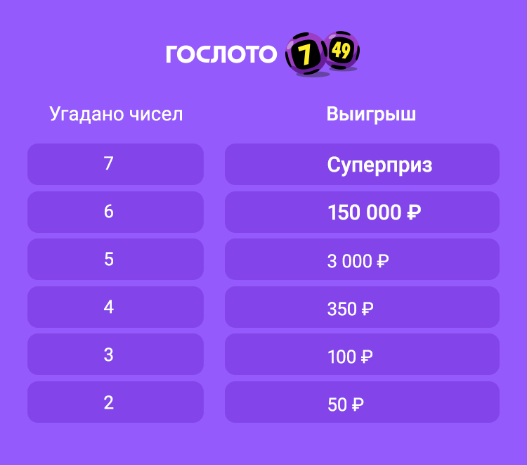 Выигрывают комбинации, в которых 2, 3, 4, 5, 6 либо 7 чисел из 49 совпали с выпавшими числами.